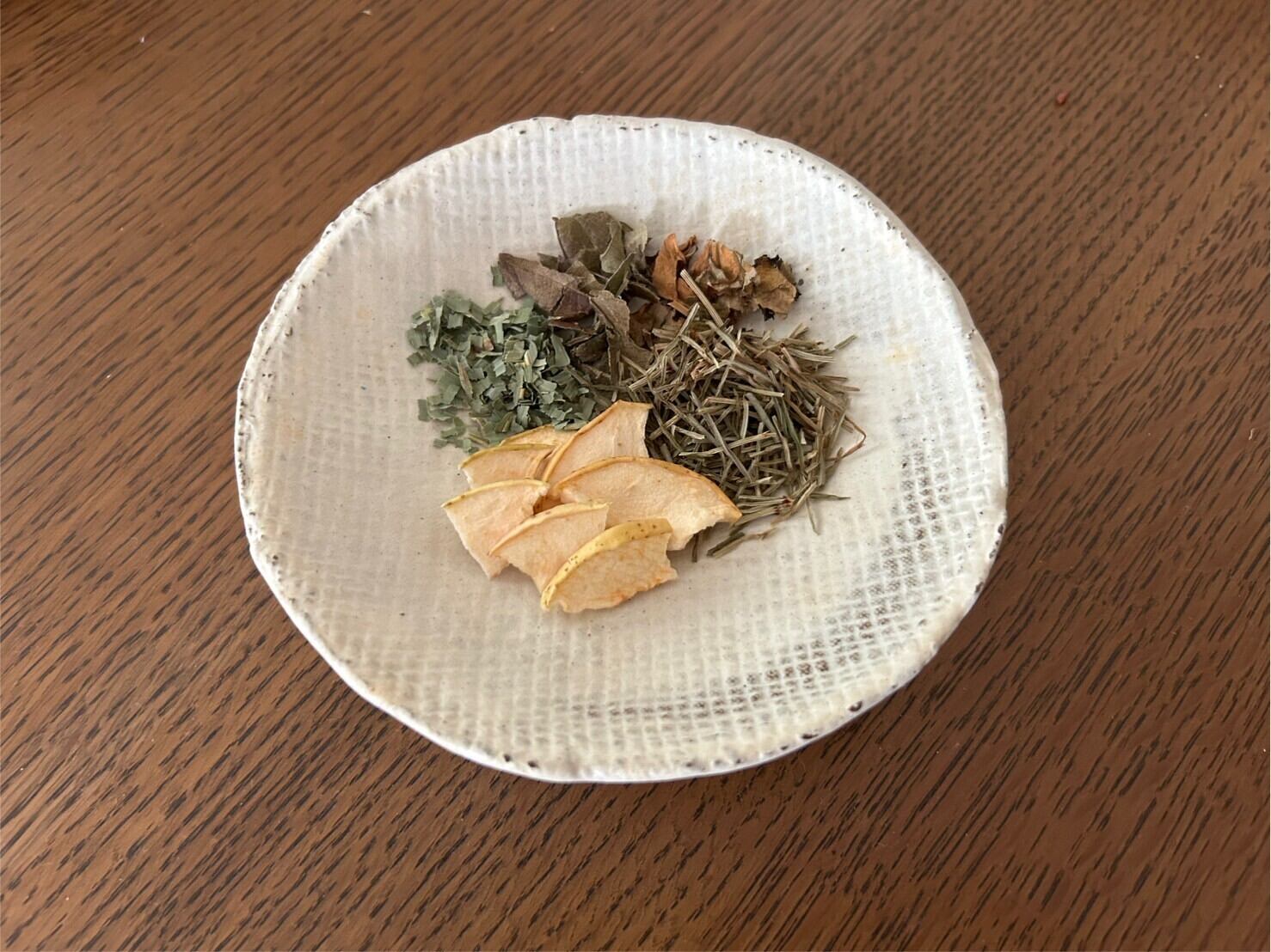 北海道七飯町の山や野原で採れる野草を自然乾燥させ、りんごを香り豊かに乾燥し