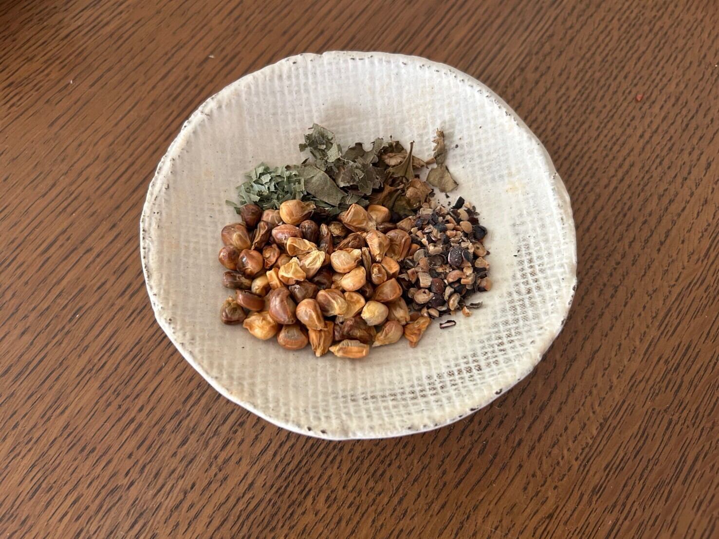 北海道七飯町の山や野原で採れる野草を自然乾燥させ、とうもろこしを香り豊かに乾燥し